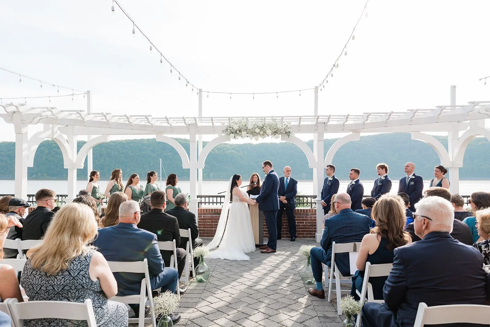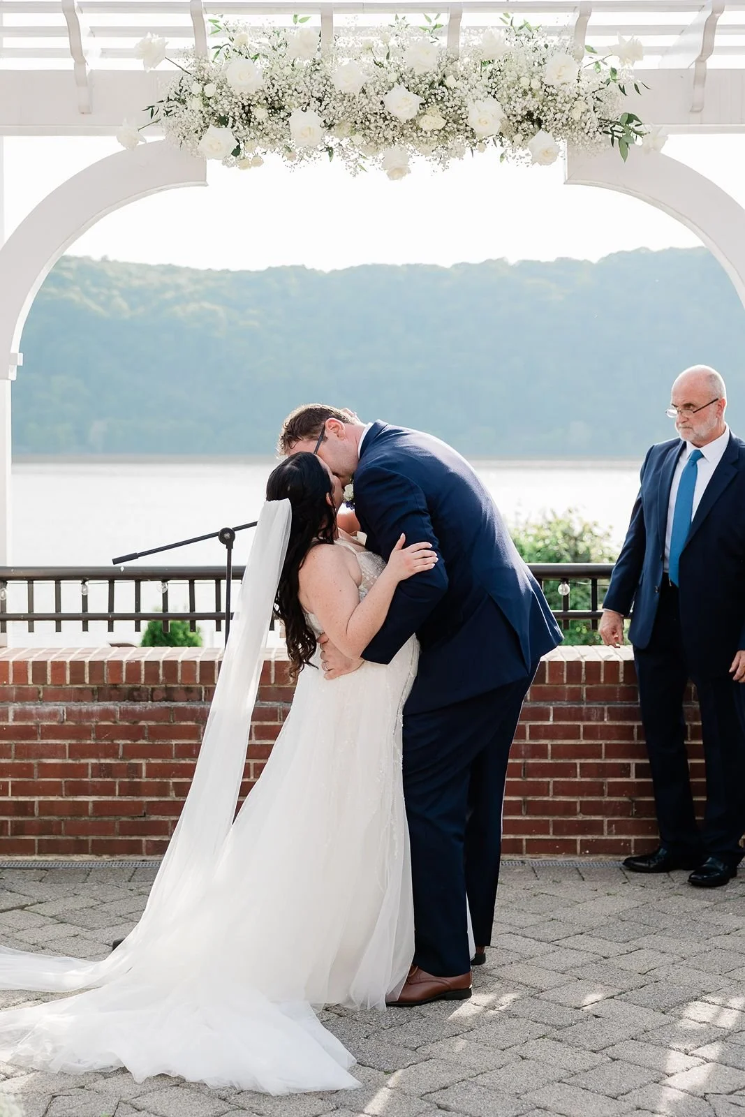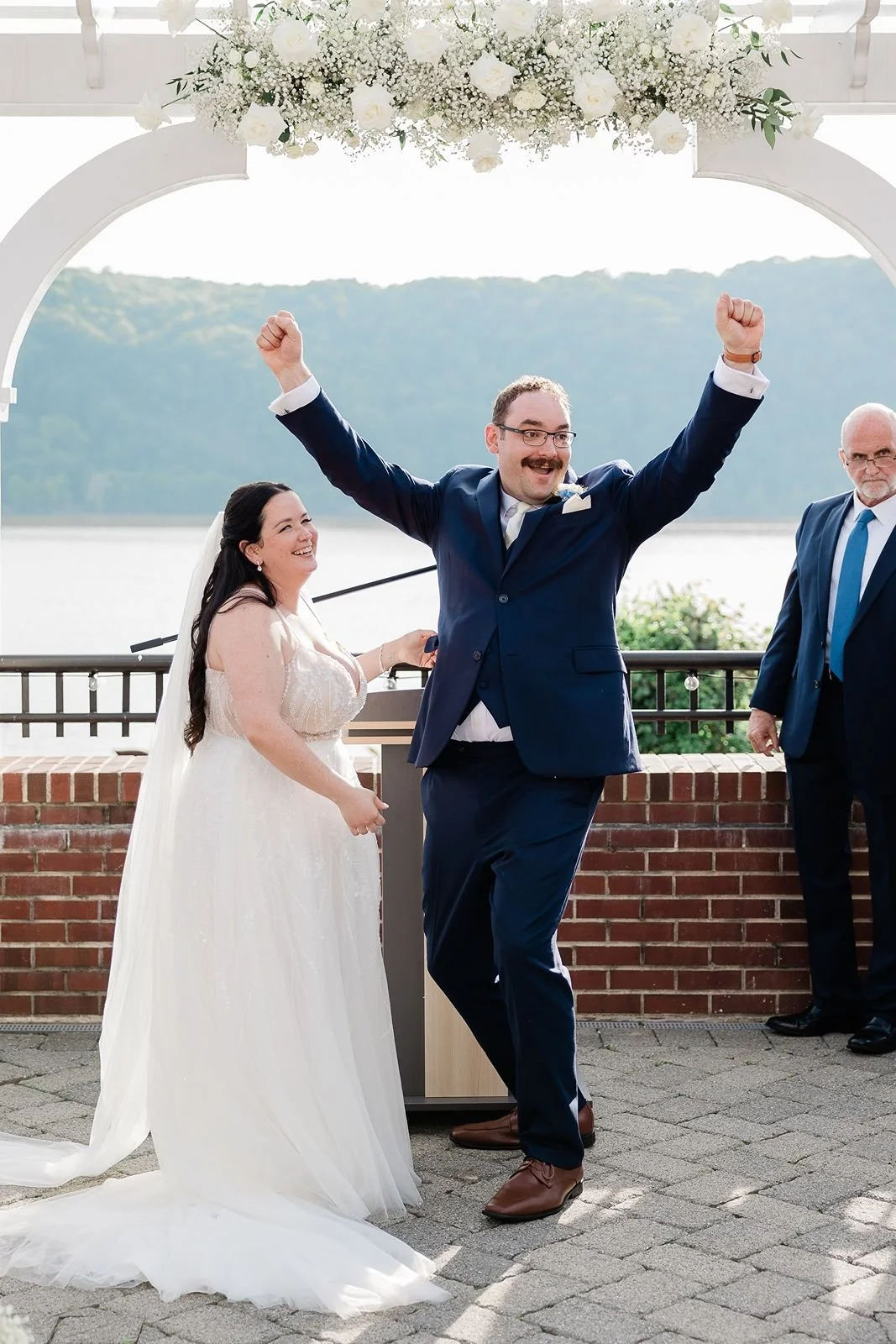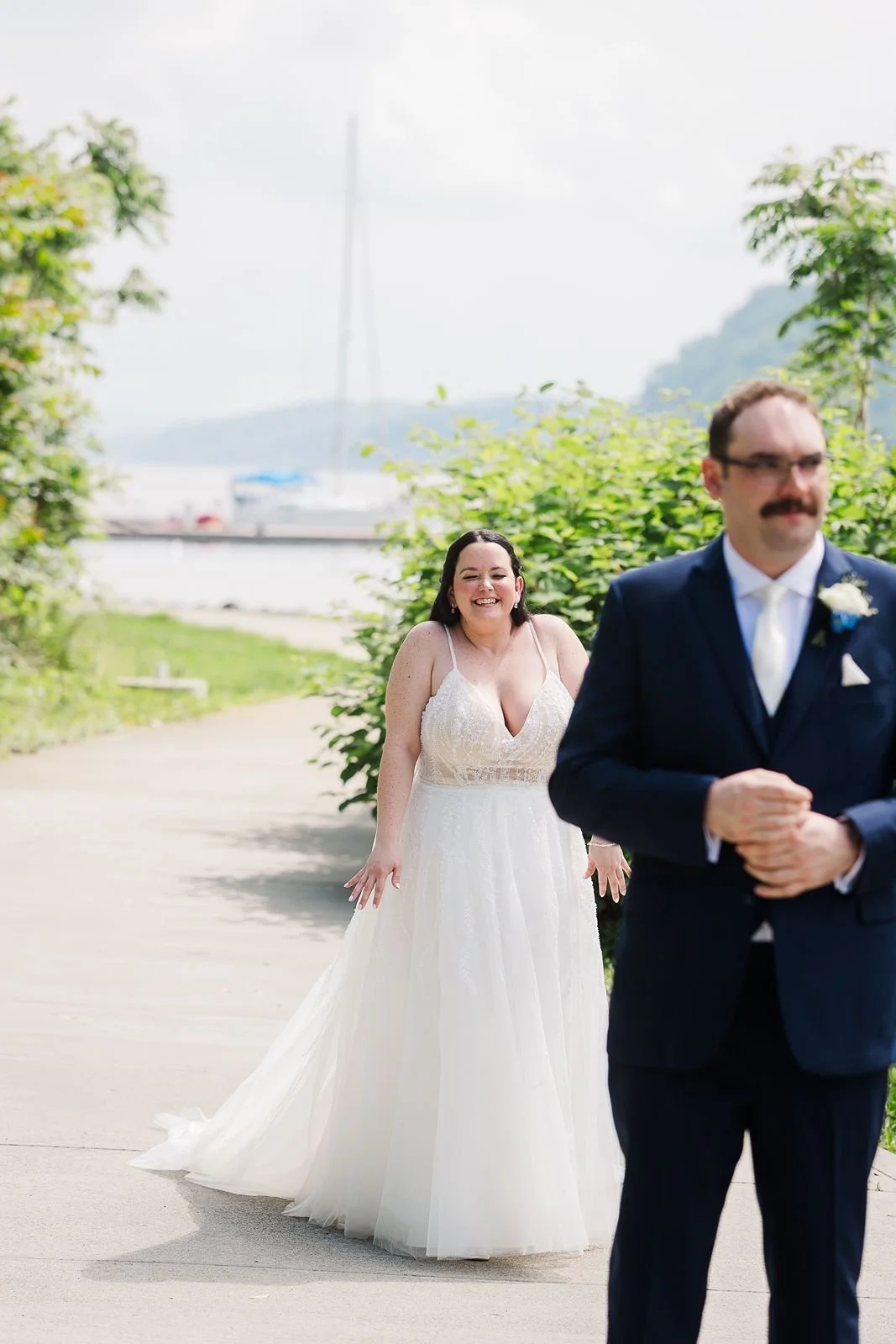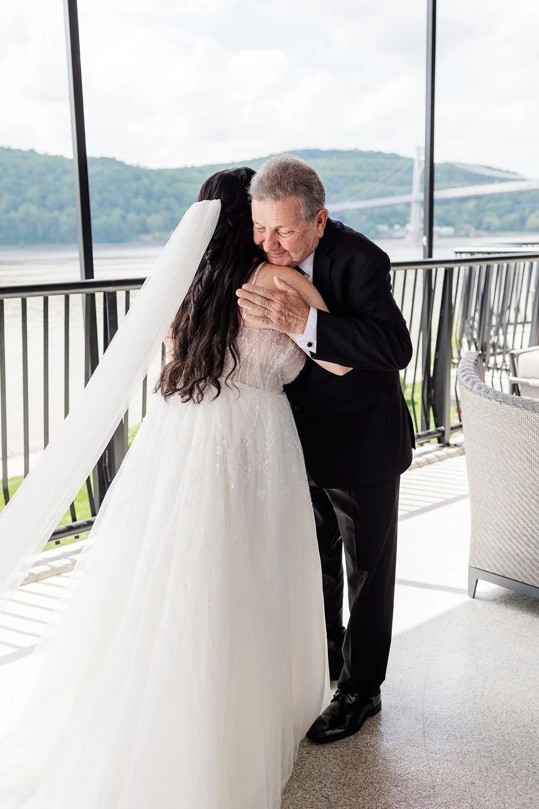 The Grandview is an award winning venue situated on the edge of the Hudson River in Poughkeepsie, NY. It offered a picture-perfect setting for their wedding day, with its sweeping views and elegant spaces. Tara and Tommy’s ceremony was held outdoors, adjacent to the Grand Ballroom, under the elegant pergola. When I was heading to the Grandview at the beginning of the day, it was drizzling. I really hoped the skies would clear since Tara and Tommy’s engagement session was photographed in the rain and while it was very romantic, they wanted an outdoor ceremony. By the time we were ready for first look, the skies had cleared and the sun was showing off! Tara’s first look with her dad was one I will never forget. After he looked at her in her stunning Lambs Hill gown, he exclaimed “this is the happiest day of my life!” Following that emotional moment, Tara and Tommy shared their first look along the waterfront of the Hudson River and Tommy couldn’t contain his excitement in seeing Tara!