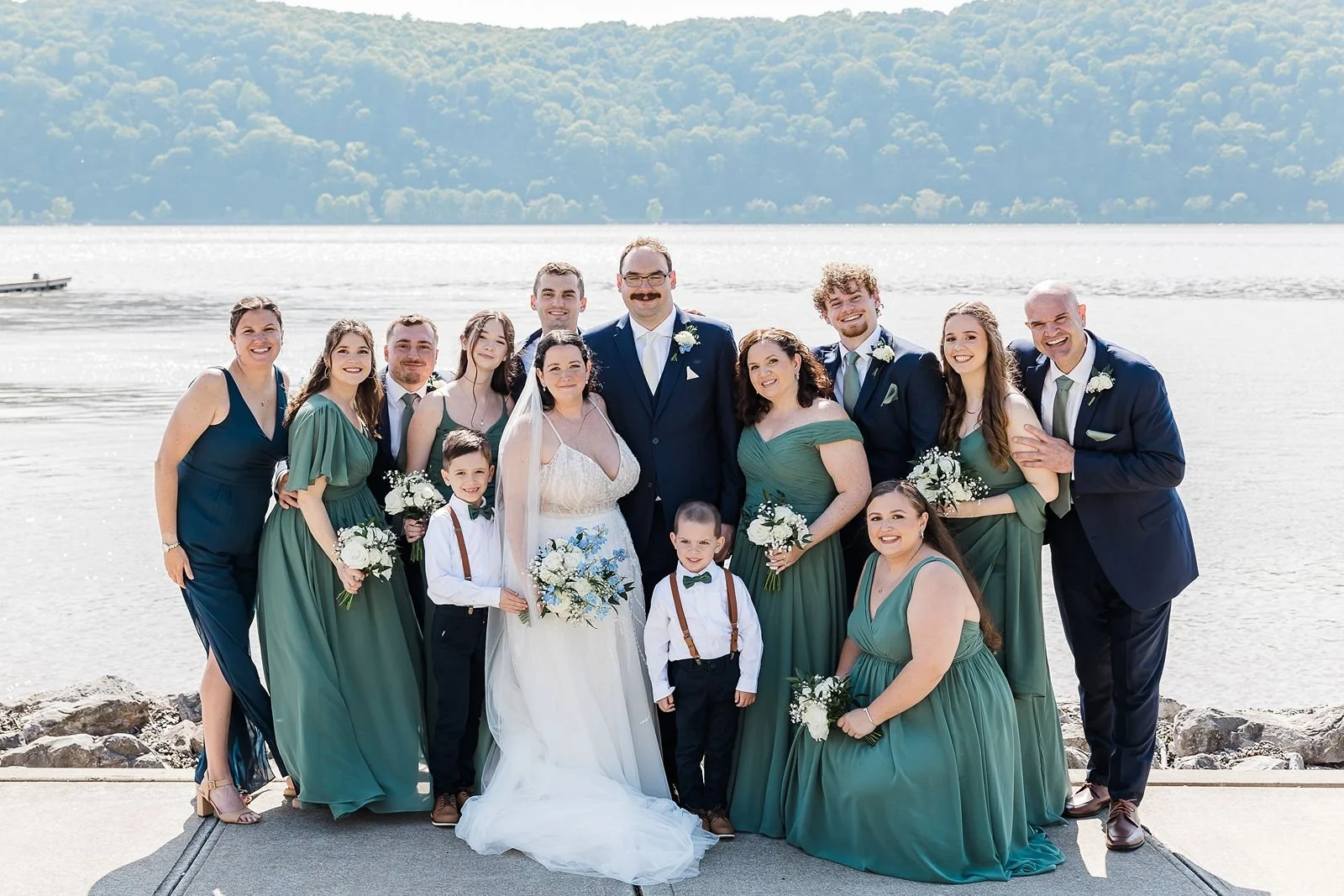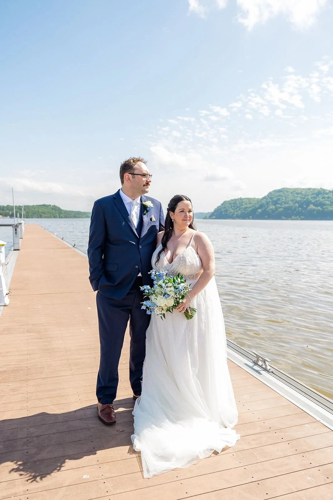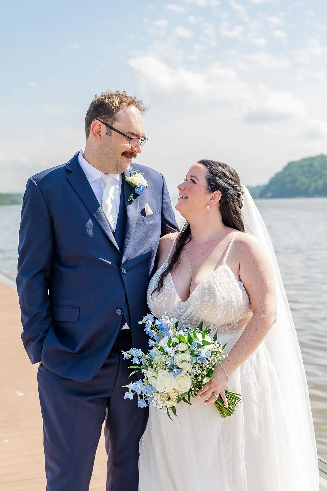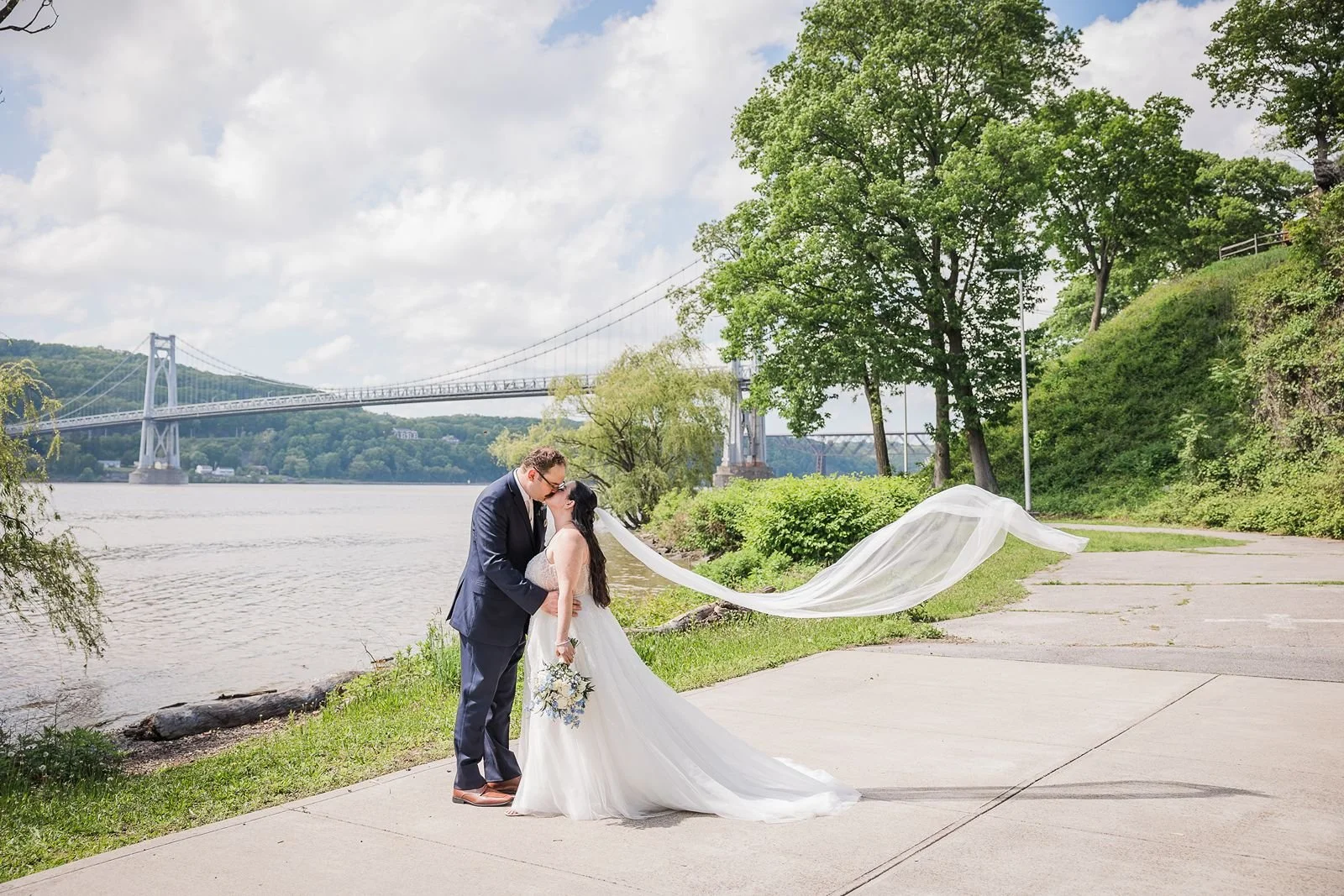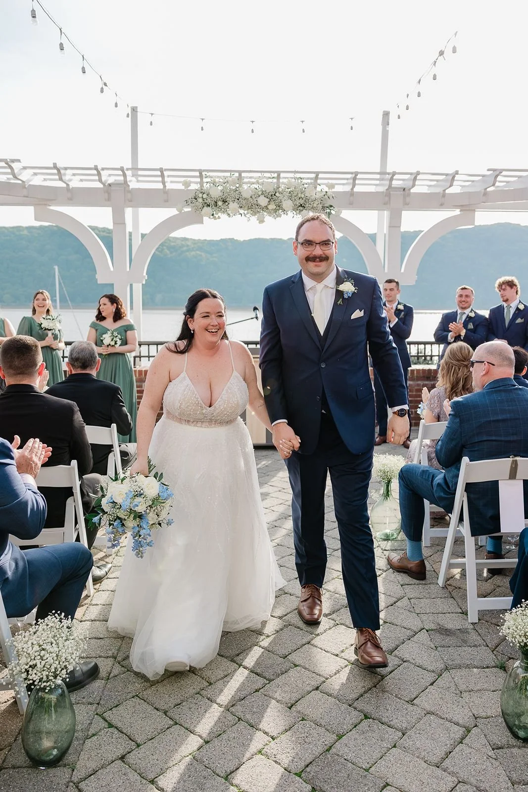 The Grandview is an award winning venue situated on the edge of the Hudson River in Poughkeepsie, NY. It offered a picture-perfect setting for their wedding day, with its sweeping views and elegant spaces. Tara and Tommy’s ceremony was held outdoors, adjacent to the Grand Ballroom, under the elegant pergola. When I was heading to the Grandview at the beginning of the day, it was drizzling. I really hoped the skies would clear since Tara and Tommy’s engagement session was photographed in the rain and while it was very romantic, they wanted an outdoor ceremony. By the time we were ready for first look, the skies had cleared and the sun was showing off! Tara’s first look with her dad was one I will never forget. After he looked at her in her stunning Lambs Hill gown, he exclaimed “this is the happiest day of my life!” Following that emotional moment, Tara and Tommy shared their first look along the waterfront of the Hudson River and Tommy couldn’t contain his excitement in seeing Tara!